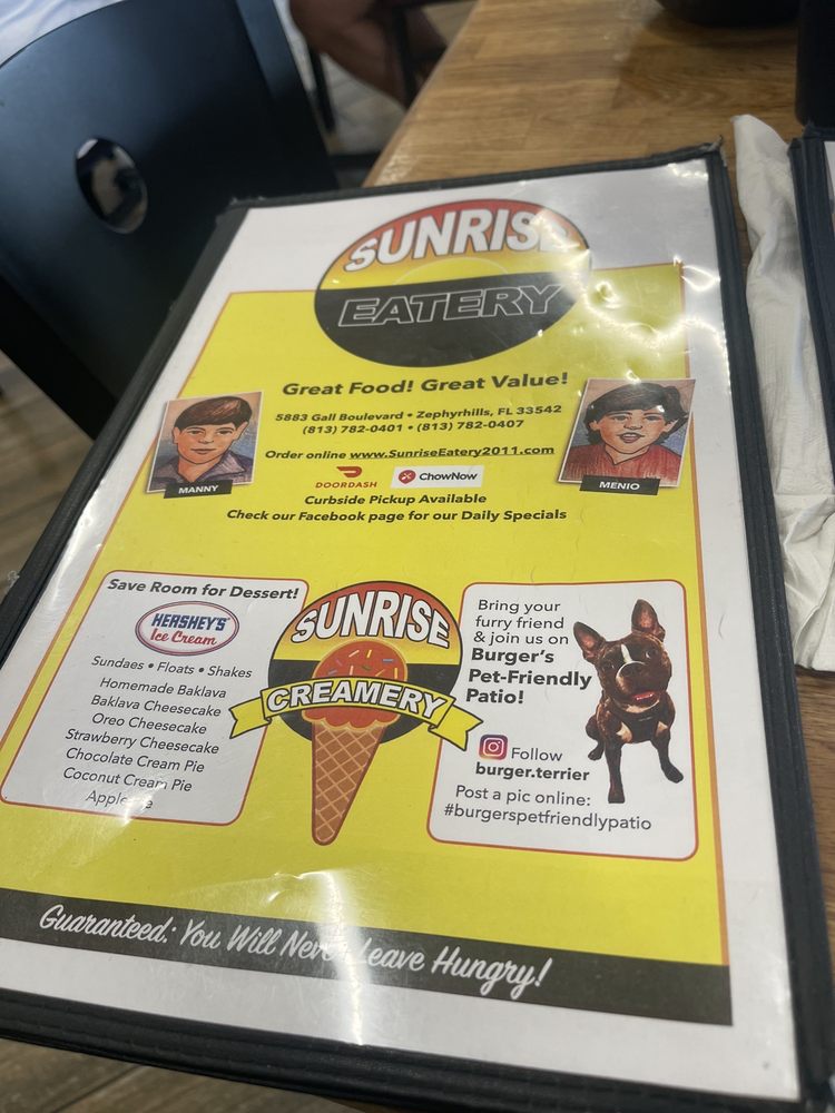 Introducing Sunrise Eatery, a bustling breakfast and brunch spot in Zephyrhills, Florida. With a diverse menu and a welcoming ambiance, this American eatery caters to all age groups and dietary preferences. The extensive beverage selection includes classic options like coffee and orange juice, while the array of sides and meat options caters to meat lovers and vegetarians alike. Customers praise the generous portion sizes and efficient service, making it an ideal spot for families and groups. The 1960s themed decor adds a nostalgic charm to the dining experience, and the outdoor patio provides a sunny spot to enjoy your meal. Whether you're craving a hearty omelet or a refreshing avocado BLT, Sunrise Eatery promises a satisfying dining experience with friendly staff and delicious food.